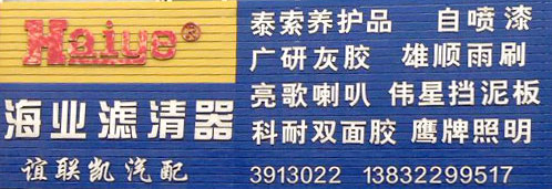 主營(yíng)品牌:濾清器、剎車(chē)片、汽車(chē)照明、汽車(chē)喇叭、自噴漆、養護產(chǎn)品、密封膠、火花塞、擋泥板、雙面膠、剎車(chē)油、雨刷片、玻璃水、汽車(chē)輔助產(chǎn)品、一次性座套、裝飾扣 地址:保定市南市區建國路416號裕豐汽配城2號樓8022號 聯(lián)系人:邱福義 電話(huà):0312-3913022 手機:13070502003 |