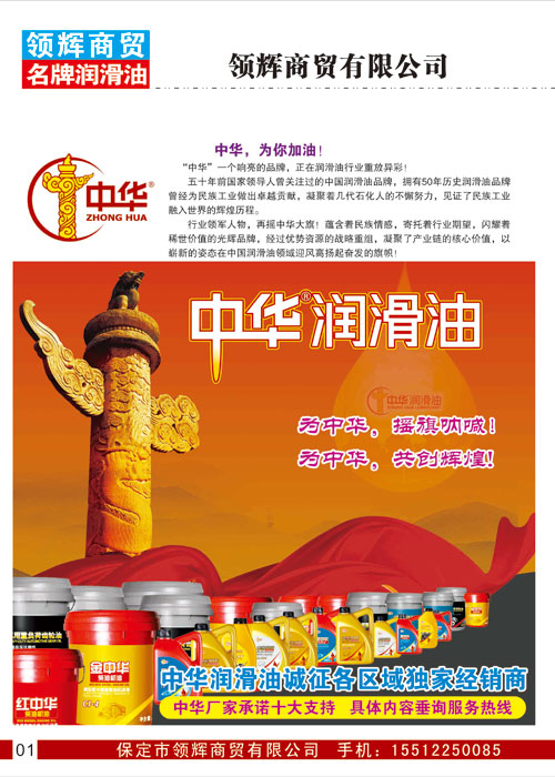 保定市領(lǐng)輝商貿有限公司是保定區域內最大的車(chē)用油及工業(yè)油品供應商之一。我公司是北京中潤華油化工股份有限公司的授權保定區經(jīng)銷(xiāo)商(中華潤滑油);(富潤達潤滑油)保定區經(jīng)銷(xiāo)商;(路馳剎車(chē)油)保定區經(jīng)銷(xiāo)商;(鴻雅剎車(chē)油)保定區經(jīng)銷(xiāo)商;(萬(wàn)友高溫脂)保定區經(jīng)銷(xiāo)商。并能為廣大客戶(hù)提供一系列其它品牌的潤滑油,如:SHELL殼牌,美孚,嘉實(shí)多、等潤滑油和防凍液。